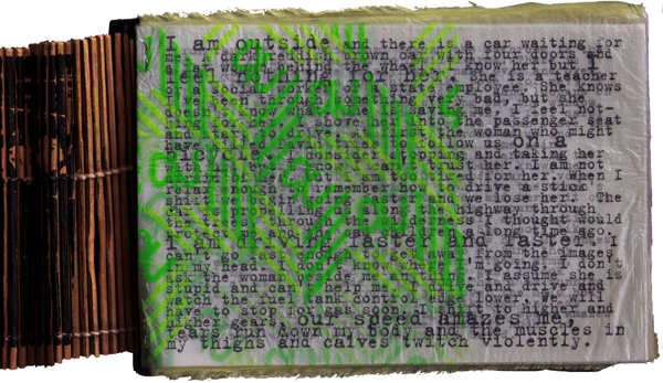 5.75 x 9", 5 pages. silkscreened images on bamboo curtain and fabric. Cover embossed on laminated found billboard. Text photocopied on bags from Albert Heijn grocery store.